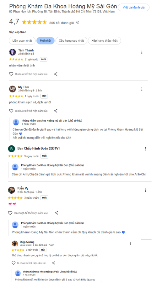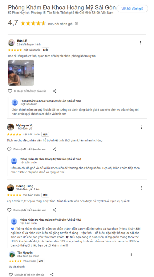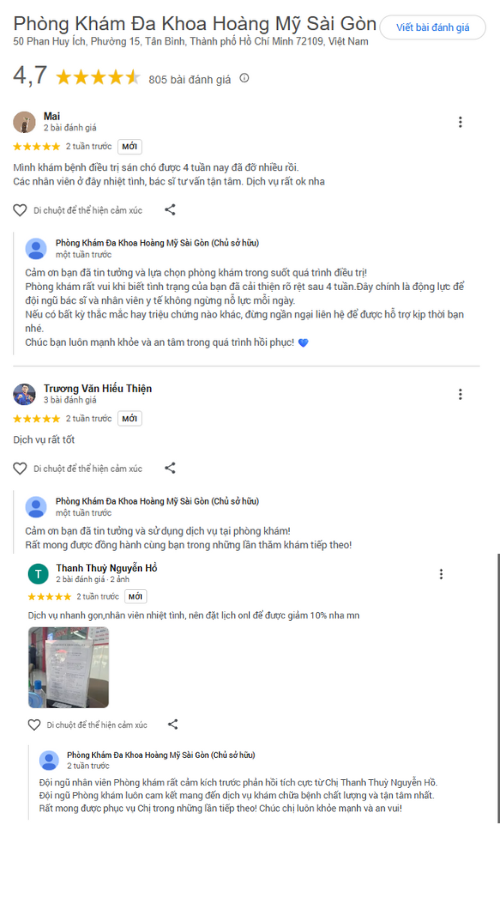 Xin chân thành cám ơn quý khách hàng đã tin tưởng và sử dụng dịch vụ khám chữa bệnh của chúng tôi! Những đánh giá của quý khách là nguồn động lực để toàn bộ nhân viên Phòng khám Đa khoa HOÀNG MỸ SÀI GÒN cố gắng nỗ lực phát triển bản thân từng ngày.