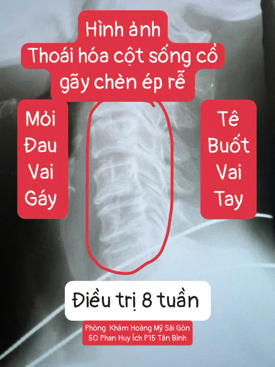 Sau khi được người quen giới thiệu, chị đến khám tại Phòng khám Hoàng Mỹ Sài Gòn với bác sĩ Kiều Phước Thọ. Kết quả cho thấy chị bị thoái hóa cột sống cổ mức độ nặng gây chèn ép rễ thần kinh cổ, thoái hóa cột sống thắt lưng chèn ép rễ L5-S1 hai bên và viêm dạ dày cấp.